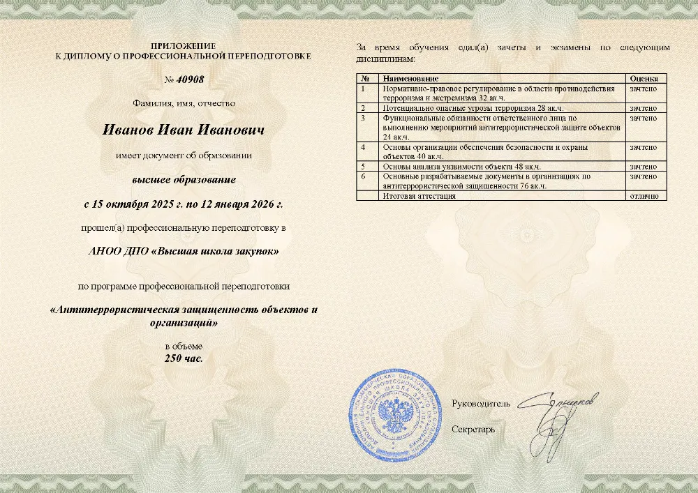 Профессиональная переподготовка, 250 академических часов, 6 модулей: нормативно-правовое регулирование и угрозы терроризма, функциональные обязанности ответственных лиц, основы безопасности и охраны объектов, анализ уязвимости и разработка необходимой документации. Онлайн-обучение в в Ростове-на-Дону с итоговой аттестацией.