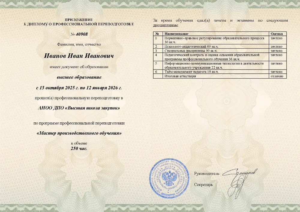 Профессиональная переподготовка, 250 академических часов, 11 модулей: нормативно-правовое обеспечение, основы педагогики и психологии, проектирование образовательных программ, методика профессионального обучения, педагогический контроль, применение ИКТ и тайм-менеджмент педагога. Онлайн-обучение в в Ростове-на-Дону с итоговой аттестацией.
